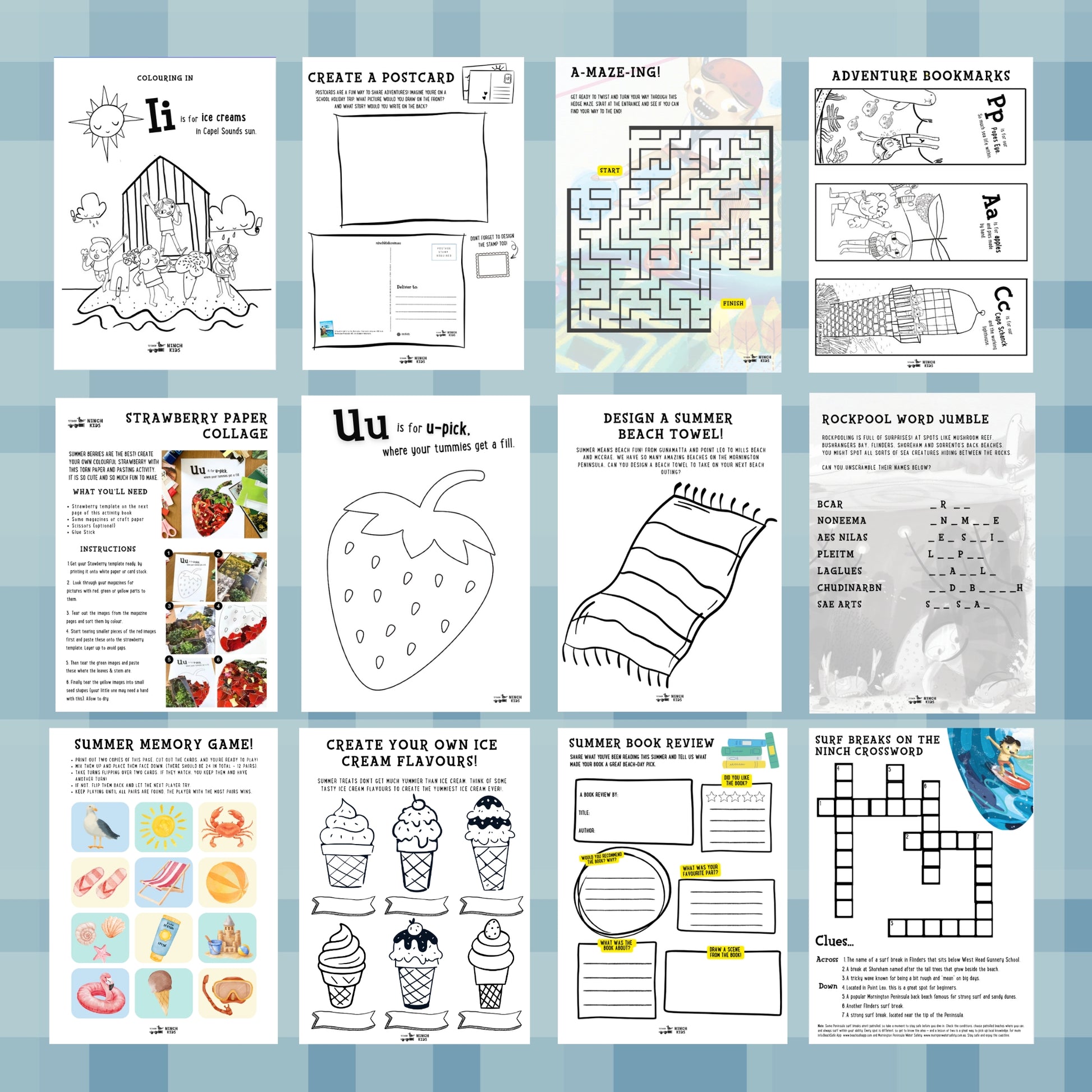 - Games and puzzles, including a summer word find, surf‑break crossword, word jumble, alphabet colouring‑in, and a rockpool jigsaw puzzle to print and make.